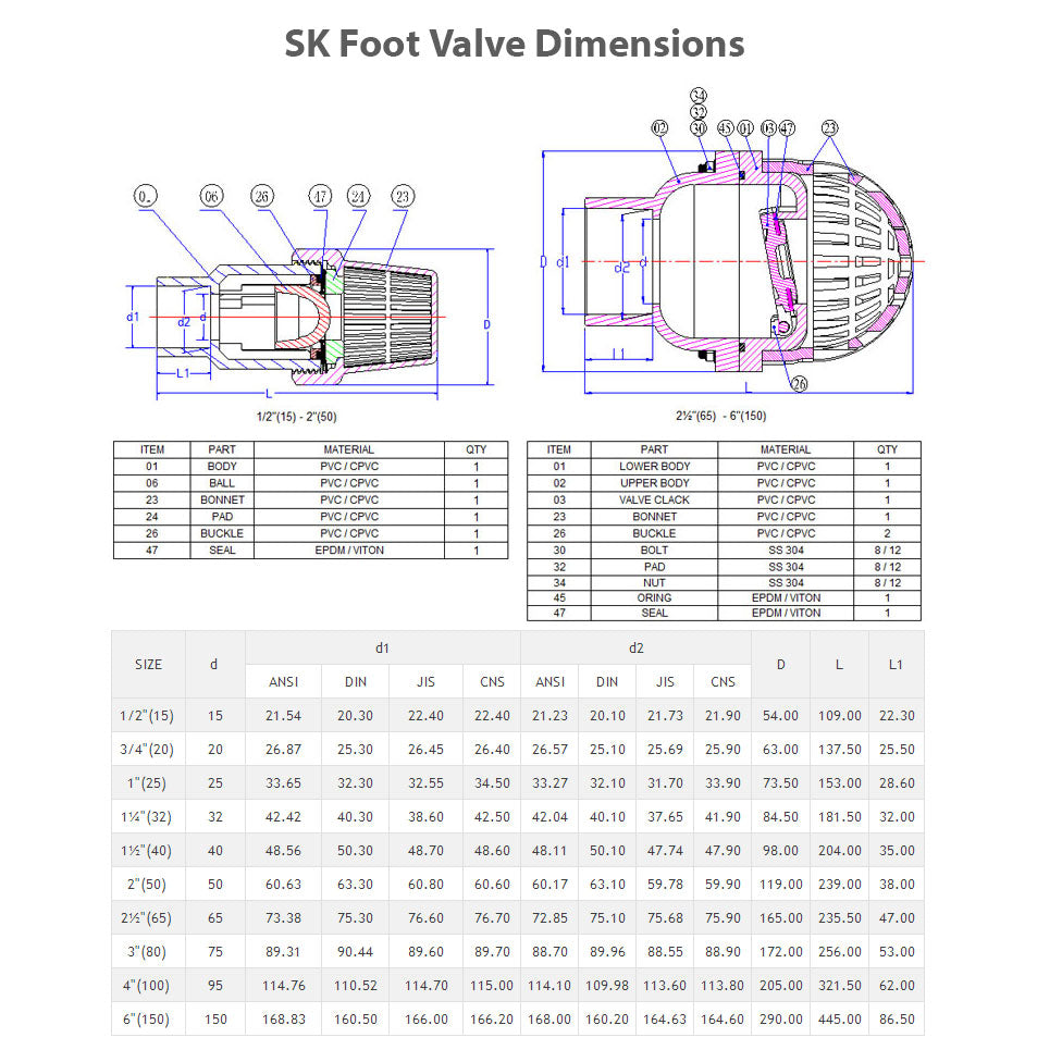 This 1-1/2" Foot Valve is availble now at an amazing price. Made with pure PVC - 150 psi. EPDM seal. Assemble and dis-assembly easily by hand for cleaning or maintenance. Available from 1/2" to 2". We have these in stock now. Order today for quick shipping from our warehouse.