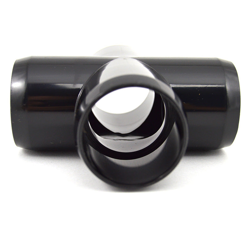 This 4-way PVC connector is also known as a side outlet tee. It is all black with a shiny finish and tapered edges. Furniture grade fittings are designed to be visually appealing but also functional. This part has all the strength and durability PVC is known for, but it does not have any manufacturer makings or bar codes. The plain black look is perfect for your PVC project ideas! Not to be used for plumbing or any pressurized applications.